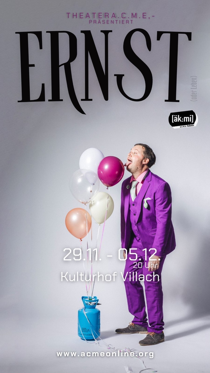 Ein Stück darüber, wo der Ernst des Lebens steckt – und warum niemand damit gerechnet hat. Am Programm steht Oscar Wildes „Bunbury“. Aber es ist nichts aufgebaut, nichts vorbereitet. Außerdem fehlt das Ensemble und vom Techniker und Bühnenbauer Ernst fehlt auch jede Spur. Doch ein Schauspieler ist da und betritt die Bühne um die Vorstellung zu retten. Das ist natürlich kein KInderspiel für ihn, denn zuerst muss er mal mit der Technik kämpfen. Hätte er doch nur was Ordentliches gelernt, denkt er sich. Etwas, das Sinn gibt. Aber was wäre das? Anyway. Am Ende steht alles, die Zeit ist ganz schön schnell vergangen. Die Show könnte beginnen, aber … Wo ist bloß der Ernst die ganze Zeit geblieben? Das ist eine Komödie! Das ist eine Komödie!